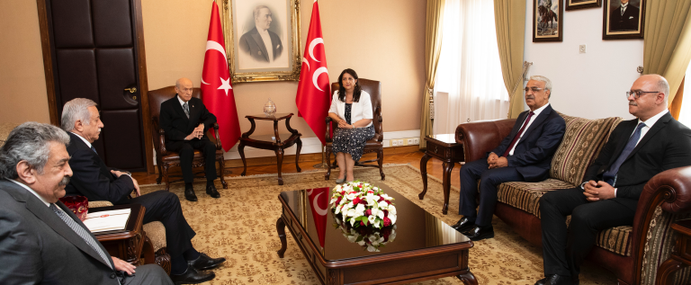 Bugün önemli bir görüşme daha yaptık. Sabahtan beri yaptığımız görüşmelerin üçüncüsü. MHP Genel Başkanı Sayın Devlet Bahçeli’ye bizleri kabul ettiği için özellikle teşekkür ediyoruz. Çok olumlu ve verimli bir görüşme gerçekleştirdik. Sürecin geldiği aşama ile ilgili bilgi alışverişinde bulunduk. Sayın Bahçeli’nin sürece dair olumlu ve pozitif görüşlerini bir kez daha dinledik. Aşama aşama hem Sayın Bahçeli’yle hem de diğer muhalefet partileri ve Cumhur İttifakının bileşenleriyle, aktörleriyle görüşmelerimizin devam edeceğini ifade etmek istiyorum. Komisyon aşamasında da birbirimize ihtiyacımız var. İstişareye ihtiyaç var. Ortak bir tutuma ihtiyaç var kanaatini taşıyoruz. Her aşamada hem Sayın Bahçeli’yi hem de diğer partilerin genel başkanlarını bilgilendireceğiz. Bu sürecin bir barış sürecine en kısa zamanda evrilmesi için gereken her türlü desteği ve mücadeleyi vereceğiz. Bir kez daha Sayın Bahçeli’ye ve heyetine teşekkür ediyorum.