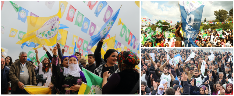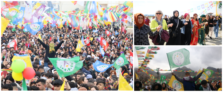 Elazığ’ın Karakoçan ilçesinde 15 Mart’ta startı verilen Newroz kutlamaları büyük bir coşku ve katılımla sürüyor. Son yılların en görkemli katılımlarına sahne olan Newroz kutlamaları bugün de Batman, Bazid, Dersim, Nusaybin başta olmak üzere 15 merkezde gerçekleştirildi. Yağış ve soğuk havaya rağmen binlerce insan Newroz alanlarını doldurarak çözüm taleplerini dile getirdi. Onbinlerce kişinin katıldığı Batman Newrozu'na Eş Genel Başkanımız Tuncer Bakırhan, soğuk ve yağışlı havaya rağmen Bazîd’de yapılan kutlamaya ise Eş Genel Başkanımız Tülay Hatimoğulları katıldı. DBP Eş Genel Başkanı Çiğdem Kılıçgün Uçar Hatay, DTK Eş Başkanı Berdan Öztürk Nusaybin, Grup Başkanvekillerimiz Gülistan Kılıç Koçyiğit Dersim, Sezai Temelli Malazgirt ve Karaçoban’daki kutlamalara katıldı.